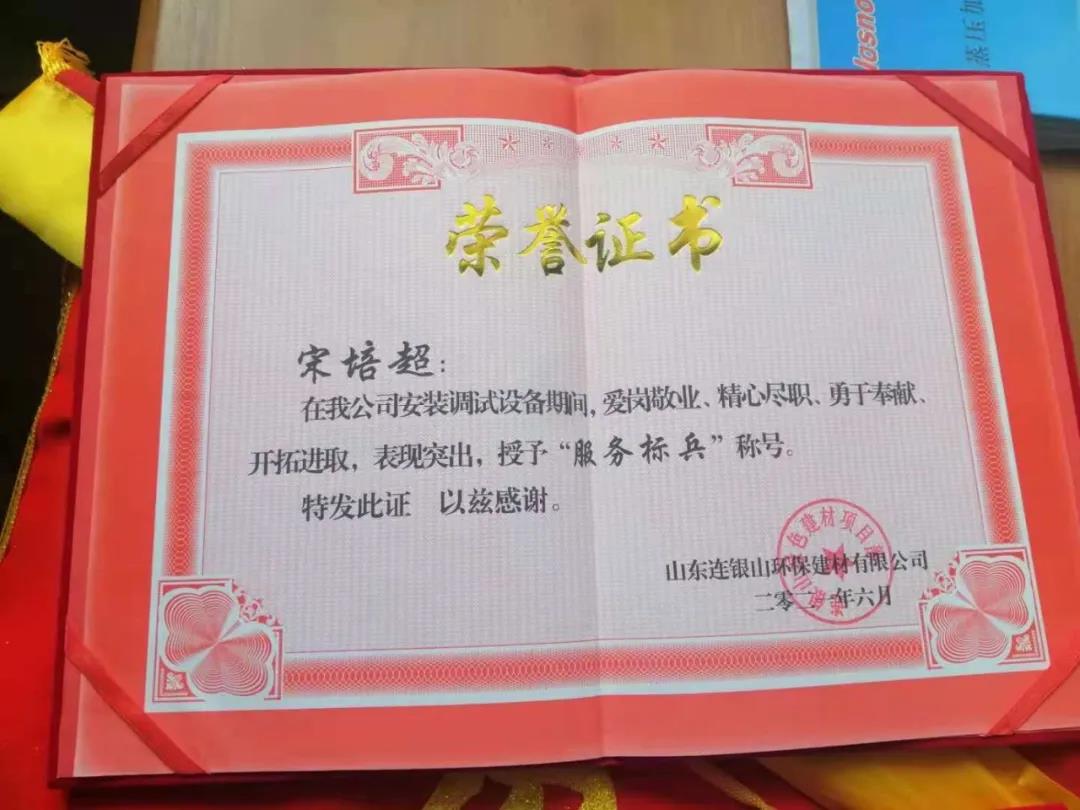 炎炎夏日,天意機(jī)械在向客戶山東連銀山環(huán)保建材有限公司售出保溫裝飾一體化板生產(chǎn)線之后,隨即派出售后團(tuán)隊(duì)對設(shè)備進(jìn)行安裝調(diào)試及售后培訓(xùn)。售后團(tuán)隊(duì)不畏酷暑,精心、耐心、專業(yè)地為客戶進(jìn)行安裝調(diào)試,贏得了客戶的好評和認(rèn)可,客戶為表達(dá)謝意,特授予天意機(jī)械售后人員榮譽(yù)證書和錦旗,以表彰售后人員愛崗敬業(yè)、精心盡職、勇于奉獻(xiàn)、開拓進(jìn)取的精神。