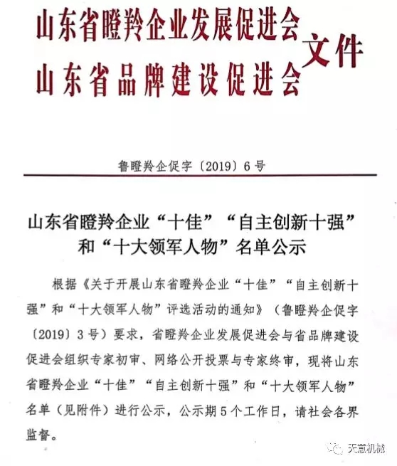 根據(jù)《關(guān)于開(kāi)展山東省瞪羚企業(yè)“十佳”“自主創(chuàng)新十強(qiáng)”和“十大領(lǐng)軍人物”評(píng)選活動(dòng)的通知》(魯?shù)闪缙蟠僮帧?/span>2019〕3號(hào))要求,2019年12月6日,山東省瞪羚企業(yè)發(fā)展促進(jìn)會(huì)、山東省品牌建設(shè)促進(jìn)會(huì)發(fā)布魯?shù)闪缙蟠僮?/span>[2019]6號(hào)文,公布經(jīng)過(guò)專(zhuān)家初審、網(wǎng)絡(luò)公開(kāi)投票與專(zhuān)家終審,評(píng)選出了山東省瞪羚企業(yè)“十佳”、“自主創(chuàng)新十強(qiáng)”和“十大領(lǐng)軍人物”。天意機(jī)械榮獲“山東省十佳瞪羚企業(yè)”稱(chēng)號(hào)。
